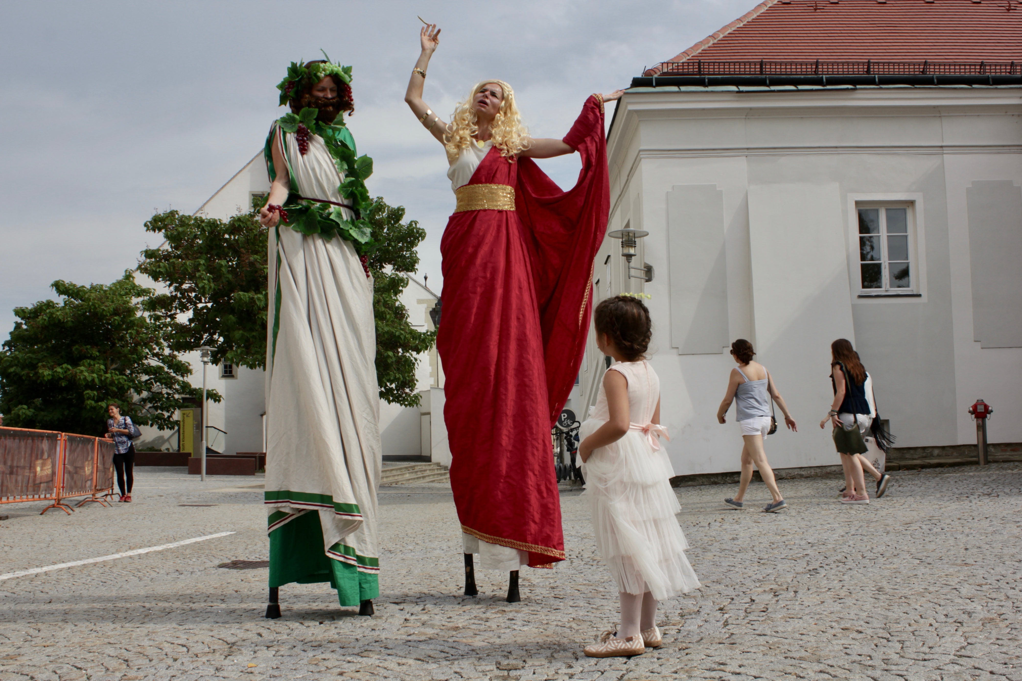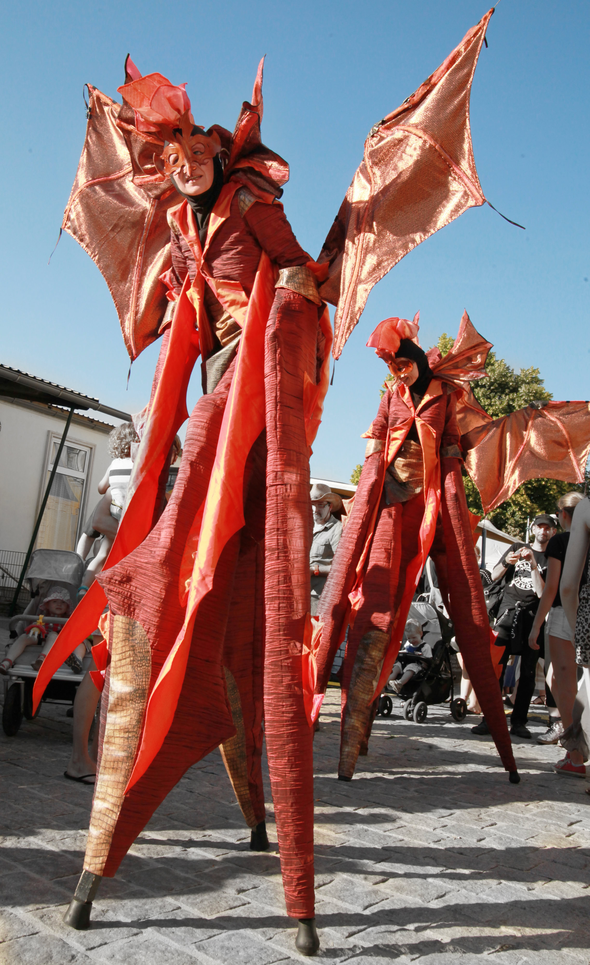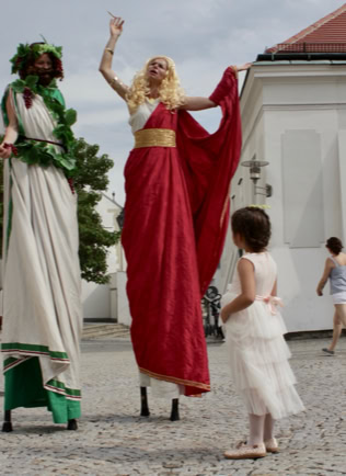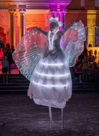 Fantasievoll gestaltete Stelzencharaktere ziehen das Publikum in ihren Bann – mal verspielt und neugierig, mal kraftvoll und erhaben.
