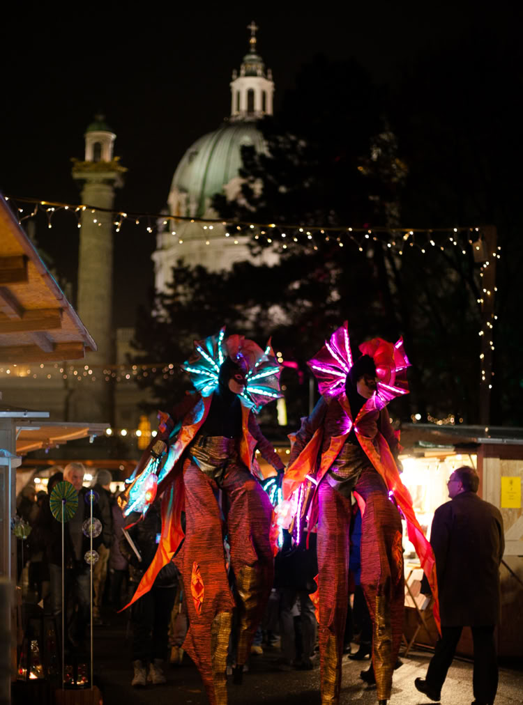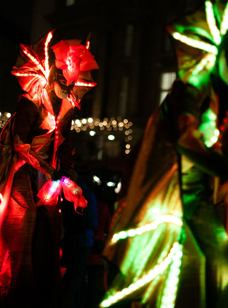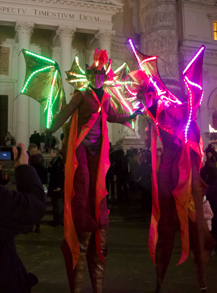Die anmutigen Drachenwesen „Peledix“ bringen die Welt der Erdenbürger:innen zum Leuchten. Durch das artistische Farbenspiel entstehen mystische Bilder der Anderswelt. Die Fabelwesen stelzen sich liebevoll in Szene und ziehen Groß und Klein in ihren Bann.