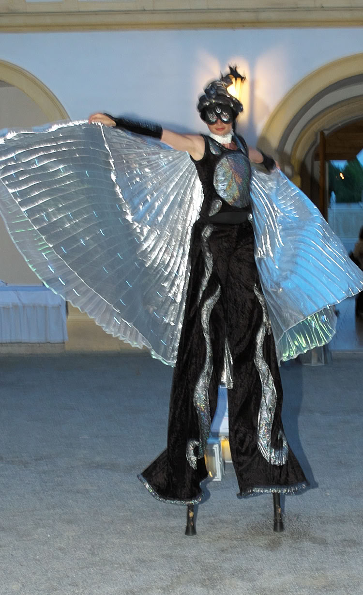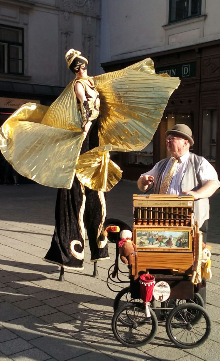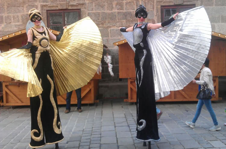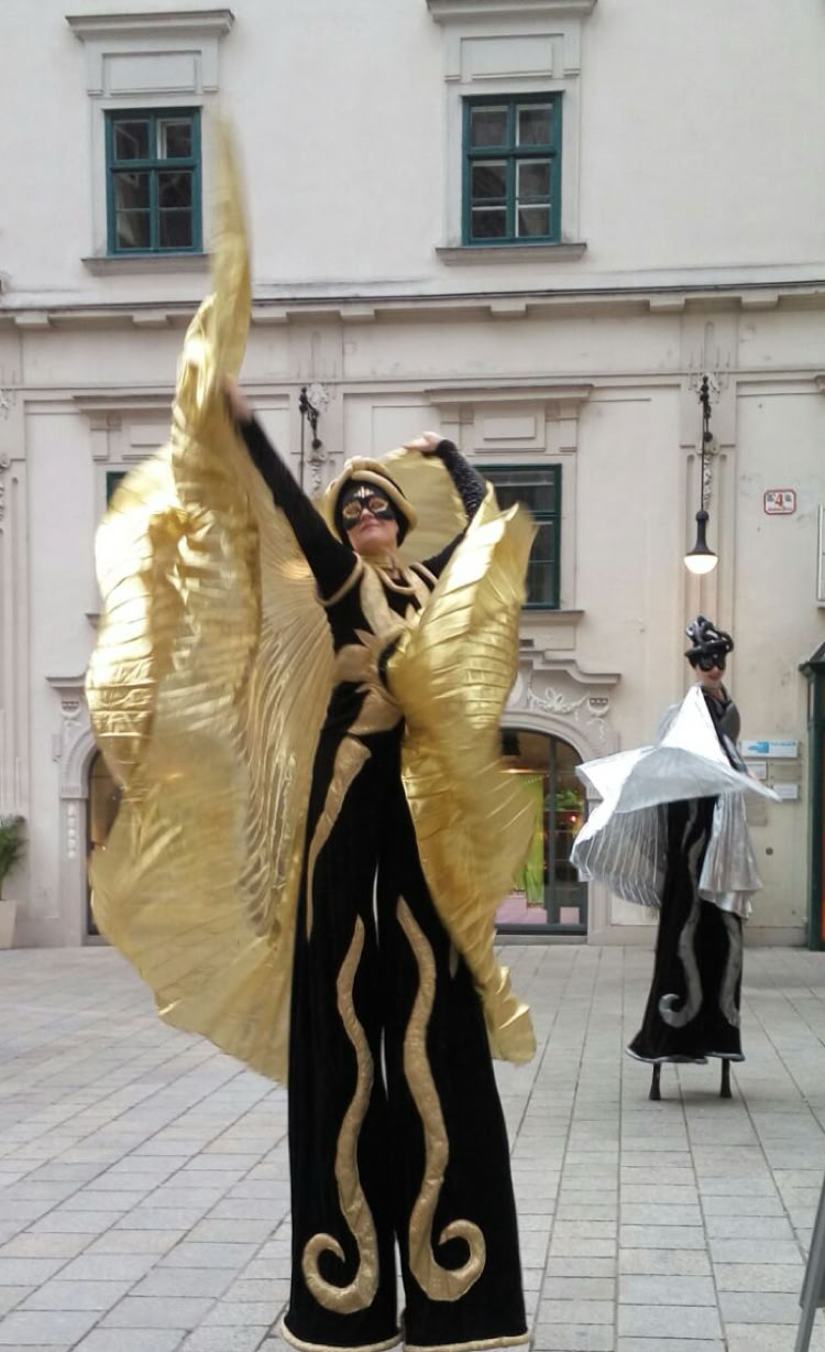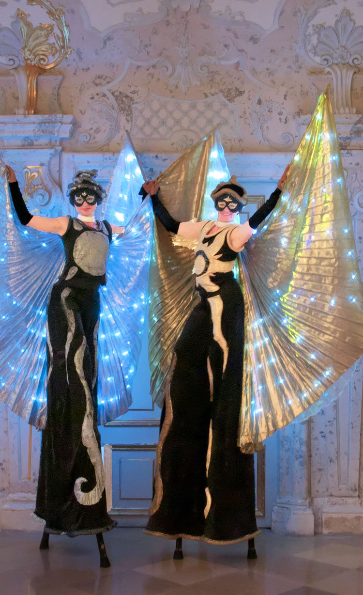 Abstrakte Sonnen- und Mondfiguren bewegen sich mit goldenen und silbernen Strahlen sphärisch durch Raum und Zeit und nehmen das Publikum mit auf eine Reise ins Universum.