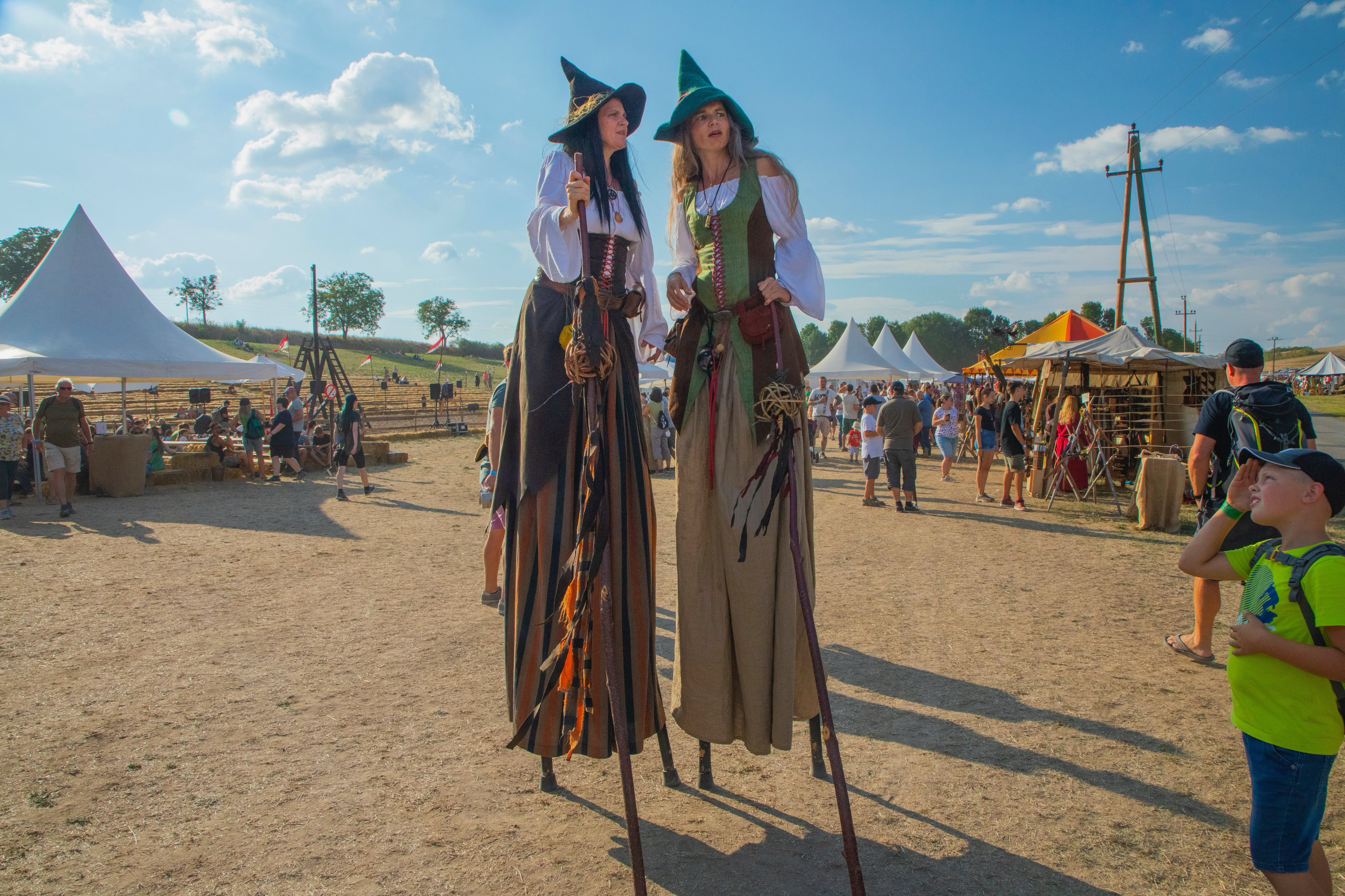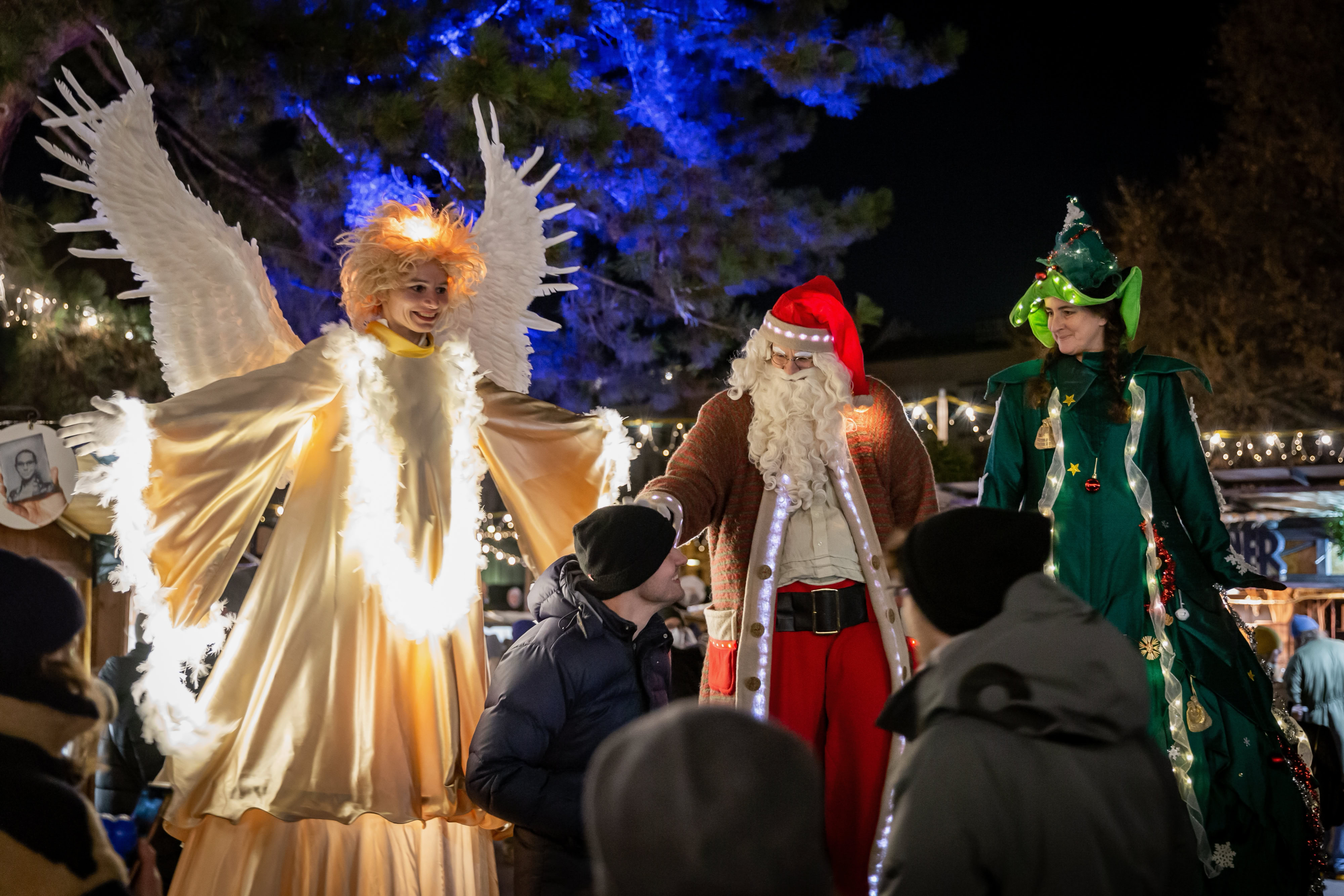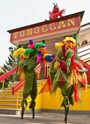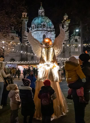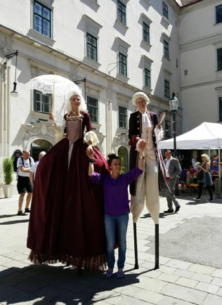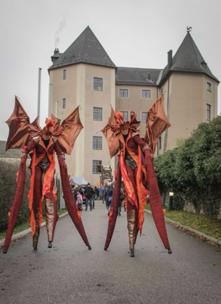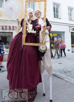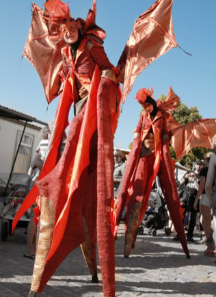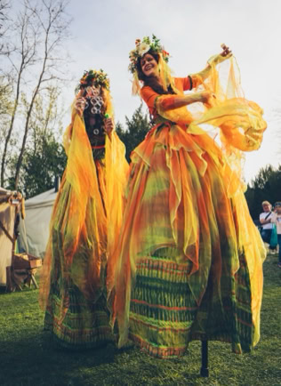 Fantasievoll gestaltete Stelzencharaktere ziehen das Publikum in ihren Bann – mal verspielt und neugierig, mal kraftvoll und erhaben.
