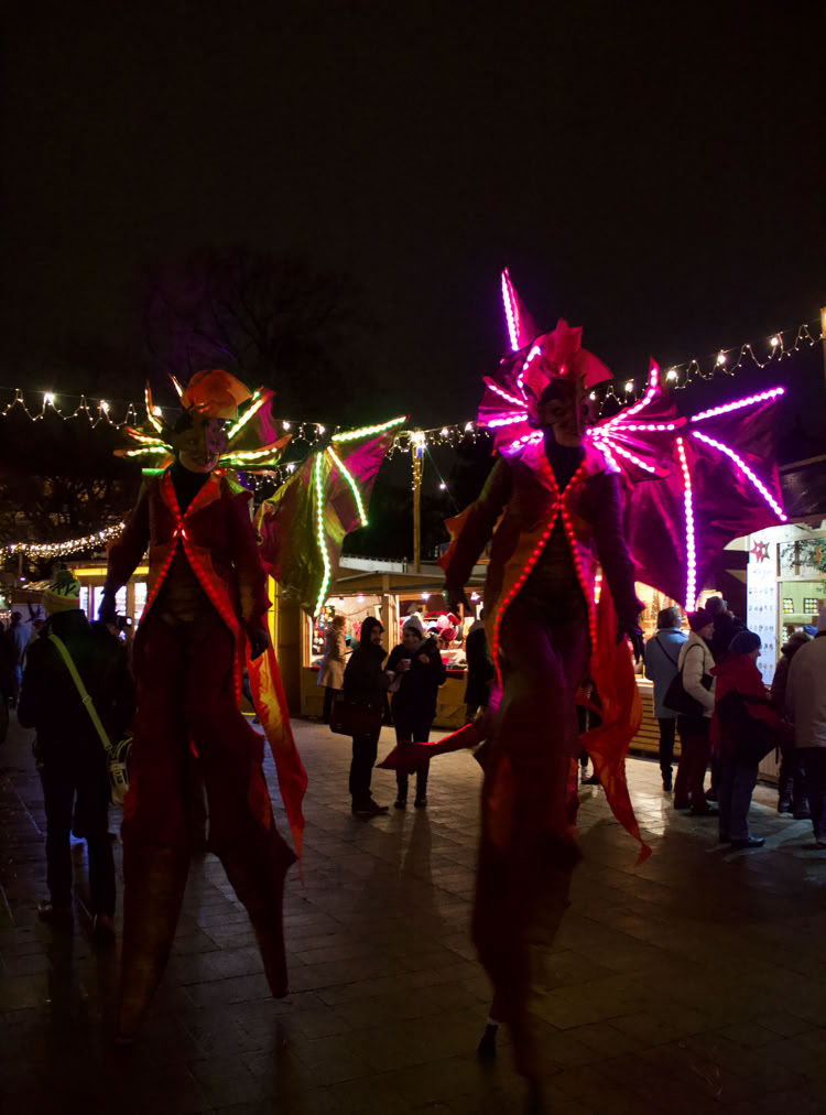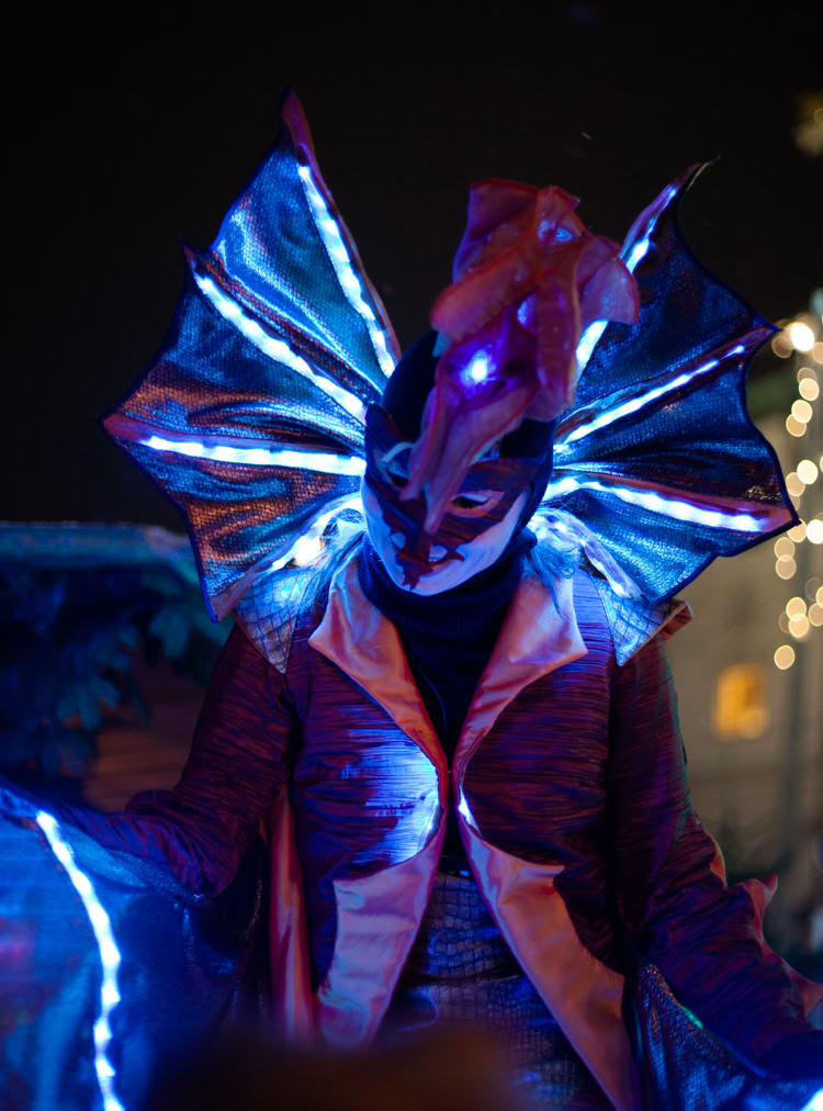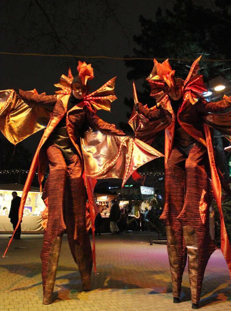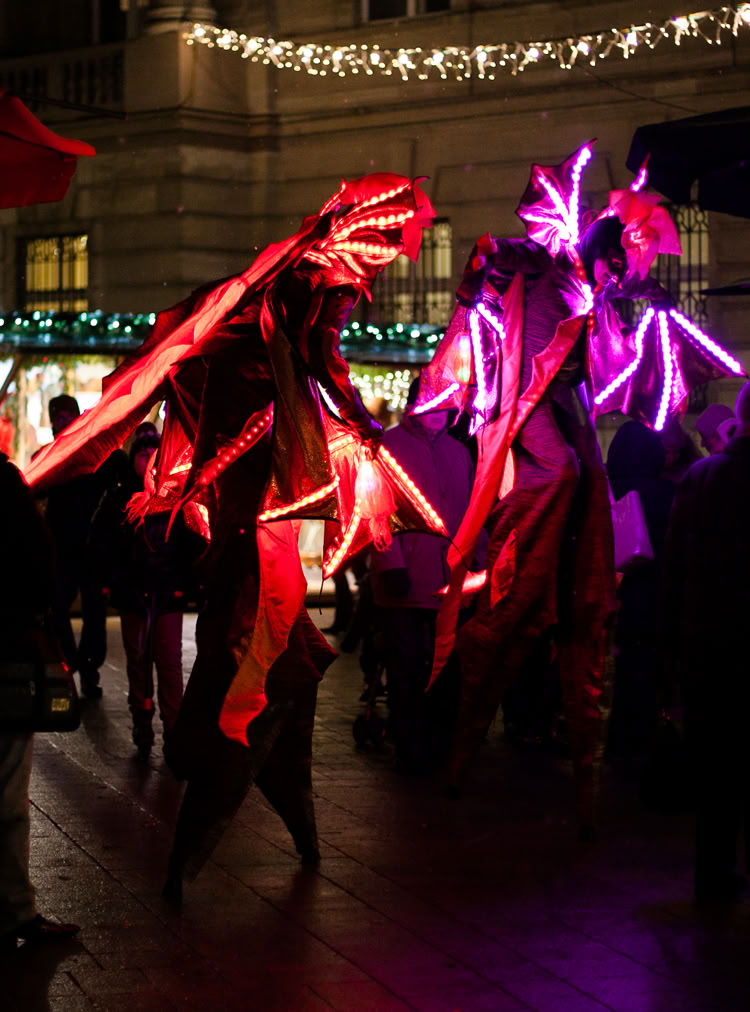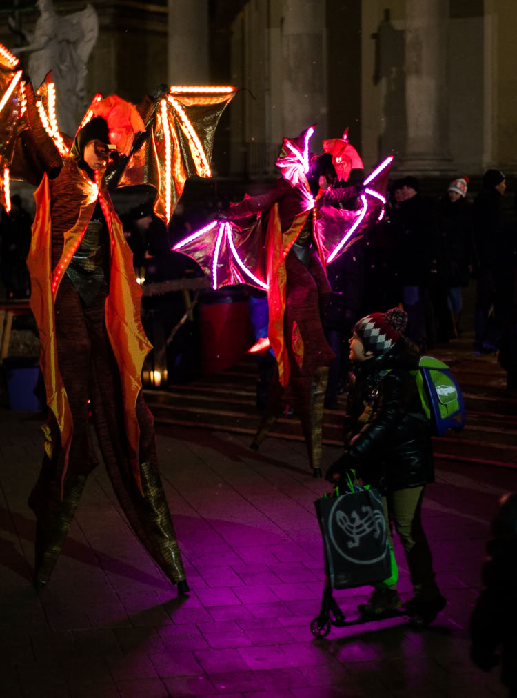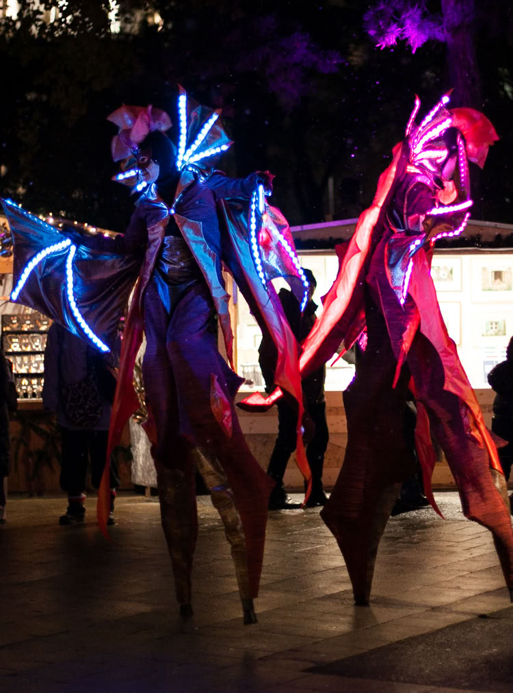 Die anmutigen Drachenwesen „Peledix“ bringen die Welt der Erdenbürger:innen zum Leuchten. Durch das artistische Farbenspiel entstehen mystische Bilder der Anderswelt. Die Fabelwesen stelzen sich liebevoll in Szene und ziehen Groß und Klein in ihren Bann.