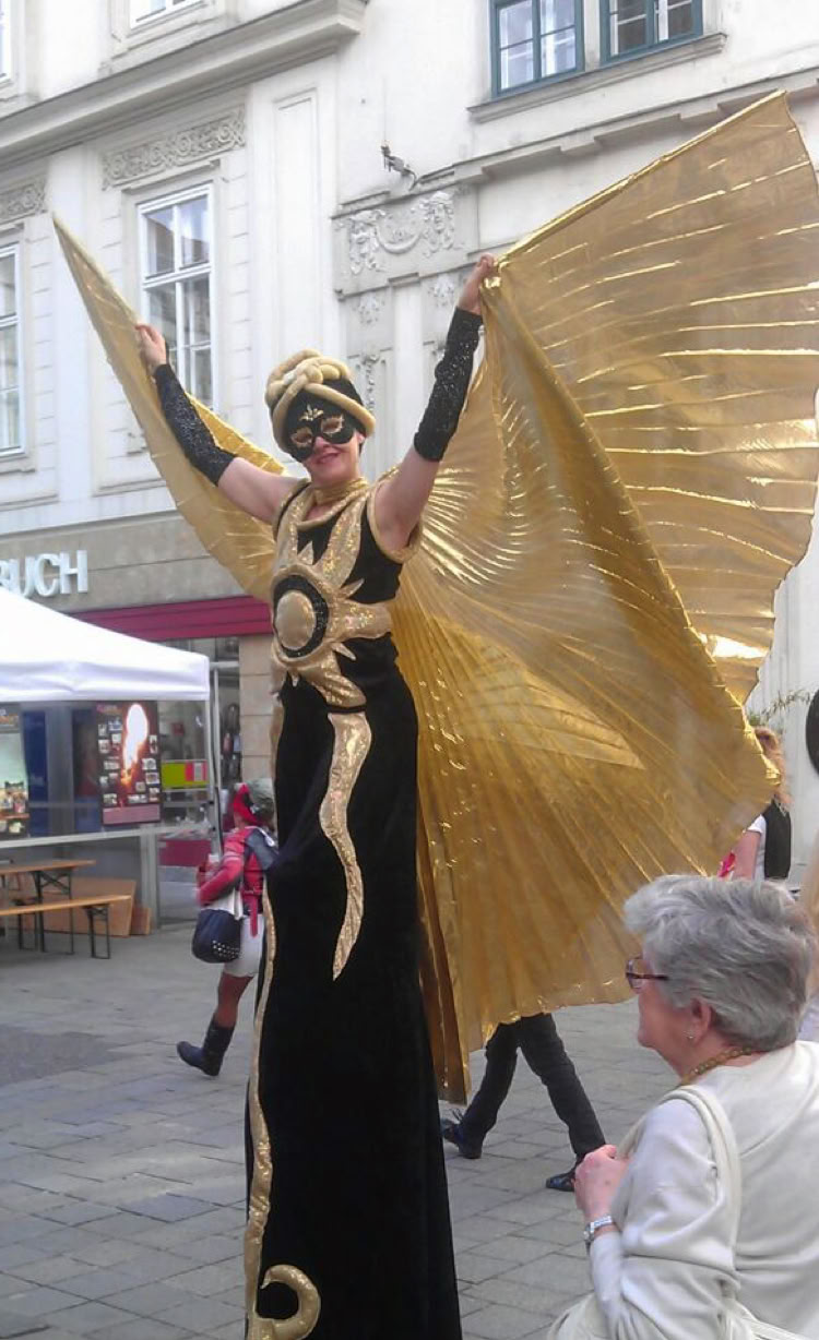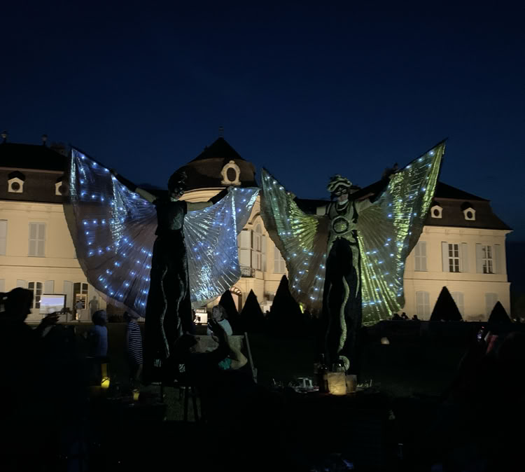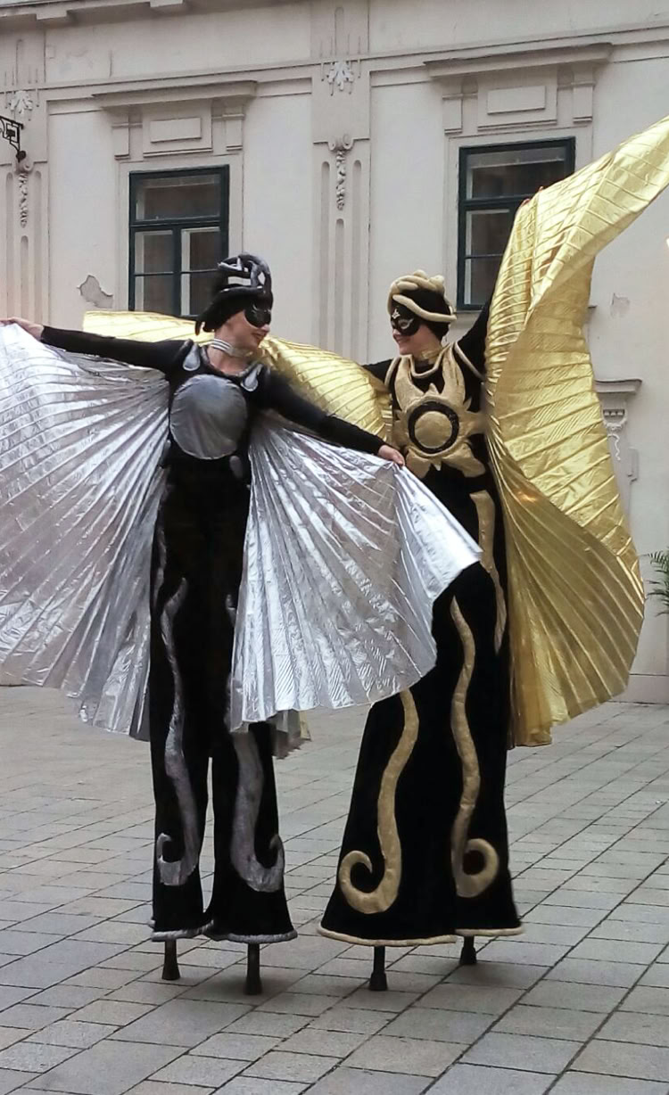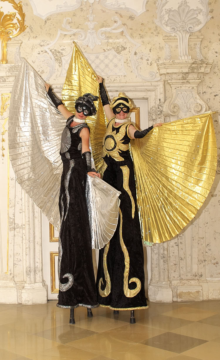 Abstrakte Sonnen- und Mondfiguren bewegen sich mit goldenen und silbernen Strahlen sphärisch durch Raum und Zeit und nehmen das Publikum mit auf eine Reise ins Universum.